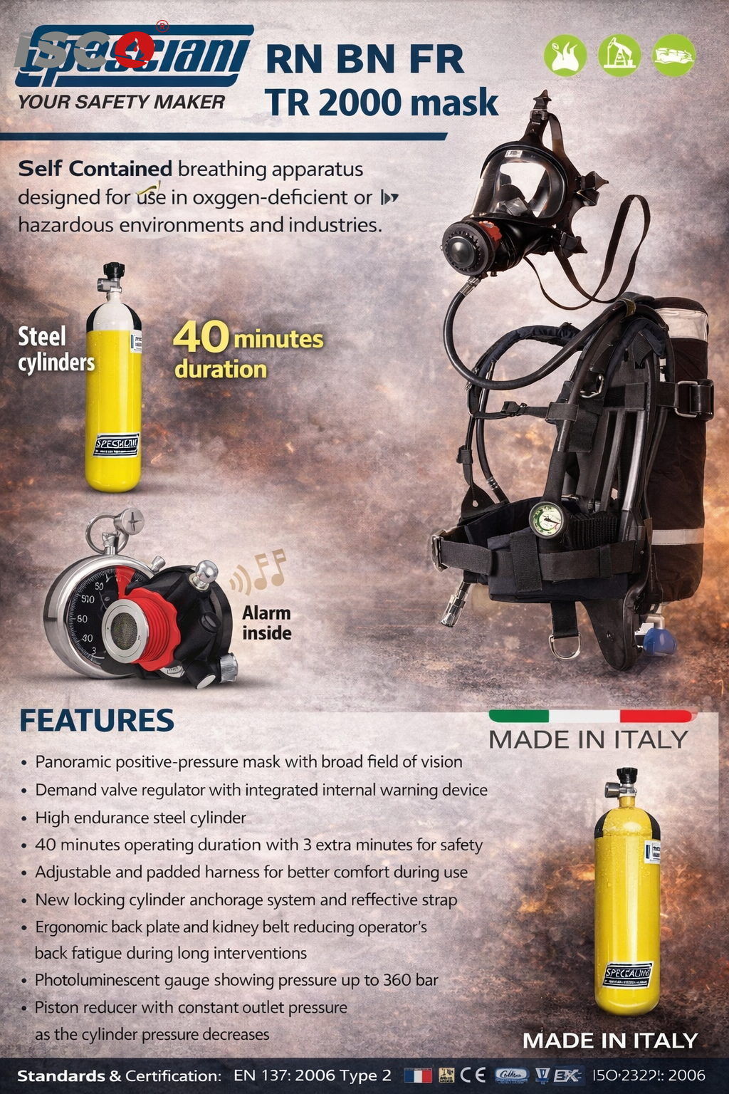 جهاز تنفّس ذاتي عالي الاعتمادية مصمم للاستخدام في البيئات الخطرة التي تعاني من نقص الأكسجين أو وجود غازات ودخان سام، ويُستخدم على نطاق واسع في أعمال الإطفاء، الإنقاذ، والصناعات الثقيلة.