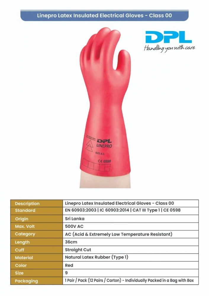 وصف المنتج :- قفازات كهربائية عازلة لاتكس LINEPRO- فئة 4 المعيار: EN 60903؛ 2003 / IC 60903؛ 2014 / CAT 3 TYPE1 / CE 05980 الأصل: سري لانكا الأعلى. الفولت: 500/1000/7500/17000/36000 فولت تيار متردد الفئة: AC (مقاومة للحموضة ودرجة حرارة منخفضة للغاية) الطول: 36 سم CUFF: قطع مستقيم المواد: المطاط الطبيعي اللاتكس (النوع 1) لون احمر الحجم: 9 التعبئة: عبوة واحدة 1 زوجًا من الكرتون معبأة بشكل فردي في كيس مع صندوق