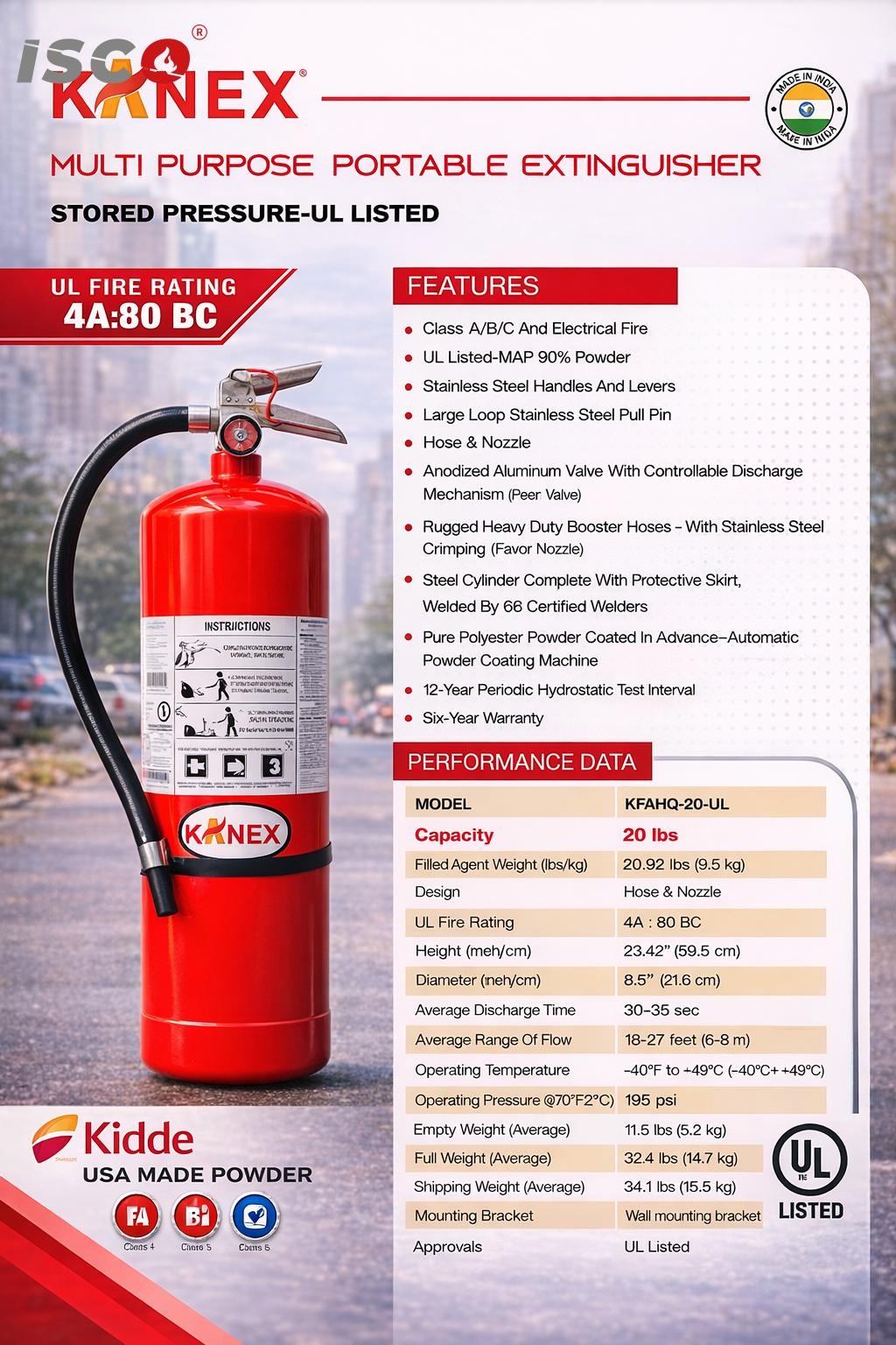 - تصنيف UL للحرائق: 20A:120BC (يوفر قدرة إطفاء استثنائية للمواد الصلبة والسوائل القابلة للاشتعال والحرائق الكهربائية).