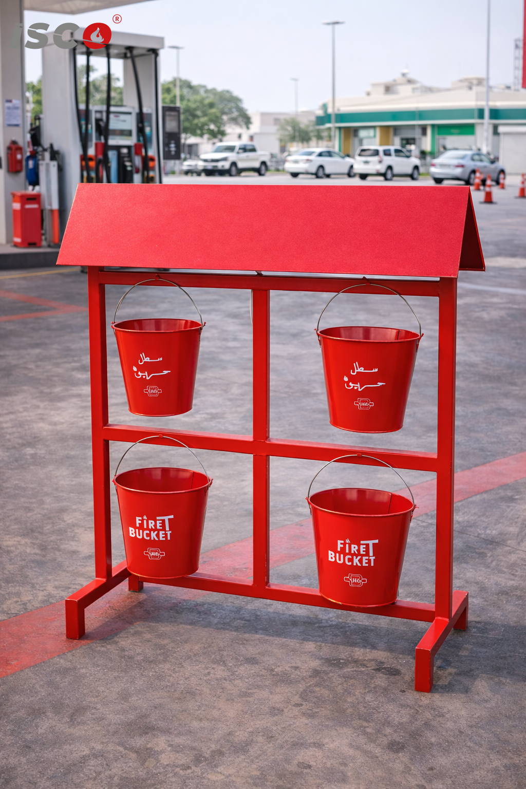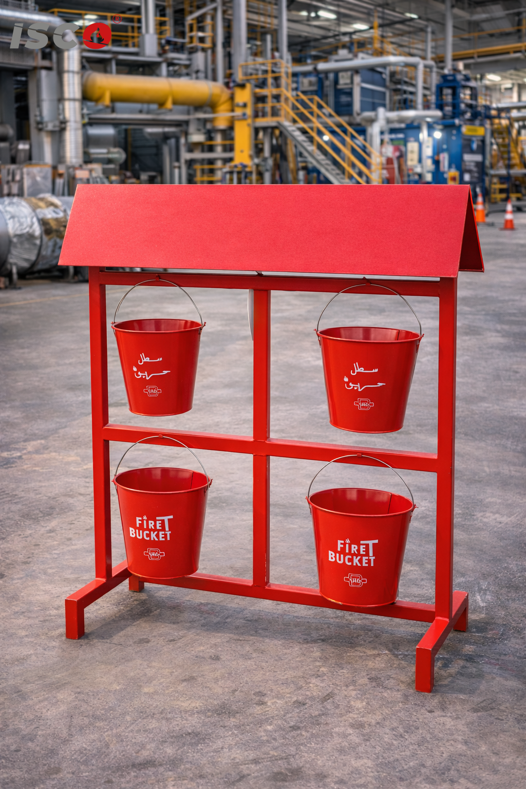 طقم سطول حريق مع حامل ومظلة، وهو نظام تقليدي وفعال يُستخدم كخط دفاع أولي لإخماد الحرائق الصغيرة في المنشآت الصناعية والتجارية.