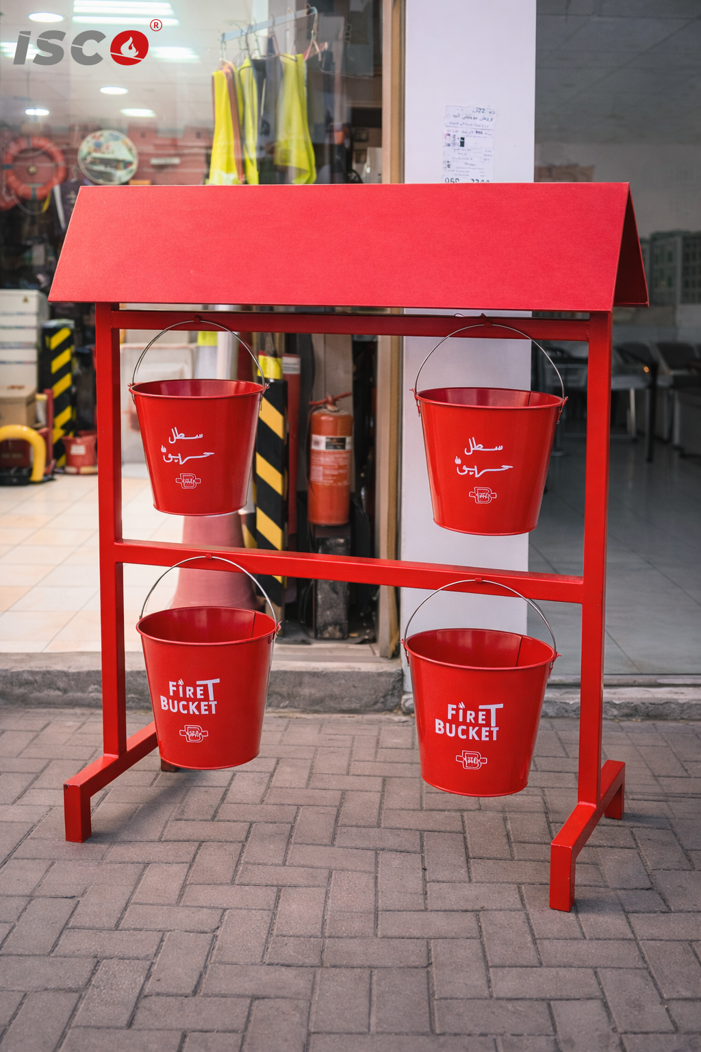 - سطول الحريق (Fire Buckets): هي أوعية معدنية مطلية باللون الأحمر الزاهي، تُملأ عادةً بـ الرمل الجاف أو الماء. يُستخدم الرمل بشكل خاص لإخماد حرائق الزيوت أو المواد الصلبة عبر خنق ألسنة اللهب ومنع وصول الأكسجين إليها.