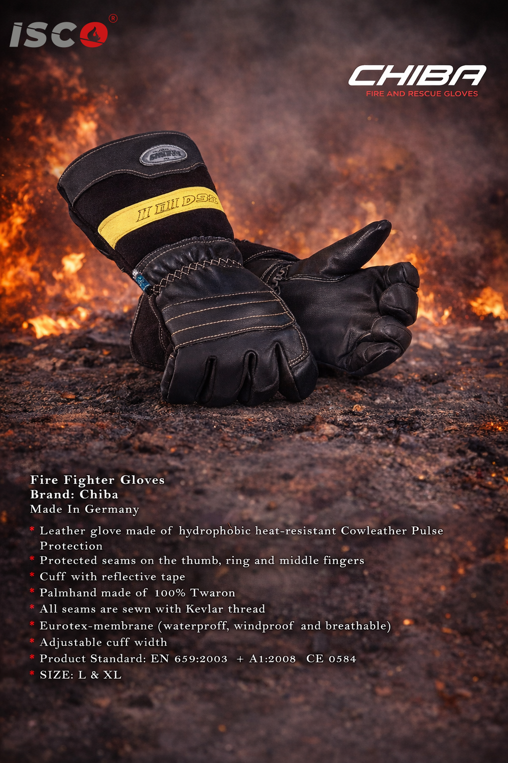 قفازات رجال الإطفاء والإنقاذ من العلامة التجارية الألمانية الشهيرة Chiba، وهي قفازات متطورة مصممة لتوفير حماية فائقة في الظروف القصوى.