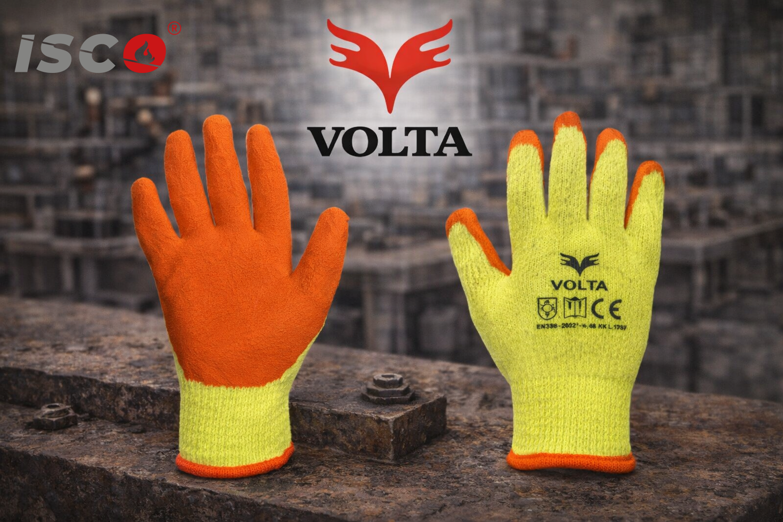 > قفازات برتقالية اللون، نصفها مغطى بطبقة لاتكس، ذات ملمس مجعد، على غلاف خارجي أصفر محبوك