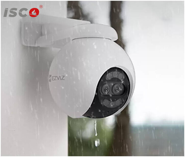 كاميرا المراقبة المتحركة واي فاي H80x المزدوجة بدقة 4K من Ezviz، وهي مصممة للمراقبة الخارجية. تتميز بعدسات مزدوجة، ودقة 4K، ورؤية ليلية ملونة، وتتبع مدعوم بالذكاء الاصطناعي.